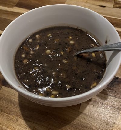 Saute the onion and garlic in the olive oil for a few minutes. Add the broth and beans and cook until onion is tender. Using a hand blender, blend the soup until most of the black beans are pureed. Then add seasonings, carrots and corn. Cook until the carrots are tender.